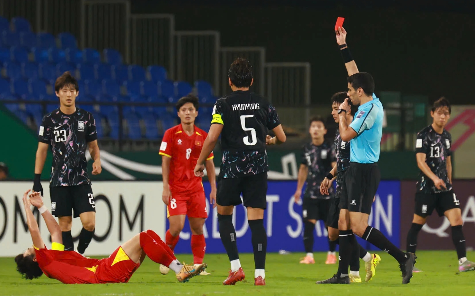 Tuy nhiên, sự cố xảy ra ở phút 86 khi Đình Bắc phải nhận thẻ đỏ sau pha vào bóng với Lee Chan-wook. Tình huống khiến U23 Việt Nam rơi vào thế bất lợi về quân số ở thời điểm then chốt của trận đấu. Trả lời truyền thông sau trận, HLV Kim Sang-sik đã lên tiếng bảo vệ học trò: “Đình Bắc đã ghi bàn và có lẽ vì quá hưng phấn nên dẫn tới một sai sót. Đó là tình huống rất khó khăn. Tuy nhiên, tôi luôn tin tưởng các cầu thủ của mình”.